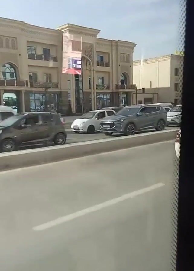 The video, shot through a vehicle window, captures a bustling urban scene. Cars of various makes and models queue at a junction, waiting for traffic to move. Visible buildings line the street, with one prominently displaying the words "BUXORO ZARGARLIK KLASTERI." Activity on the building's façade suggests ongoing maintenance or construction. The day appears bright, with a clear sky overhead.