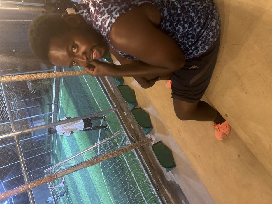 A person stands next to a fenced soccer field. The person is facing the camera with their fingers near their face, and is wearing a printed shirt, athletic shorts, and pink athletic shoes. In the background, people are visible on the artificial turf soccer field playing a game. Green seating lines the side of the field next to a concrete walkway. The fence is made of netting and metal poles.
