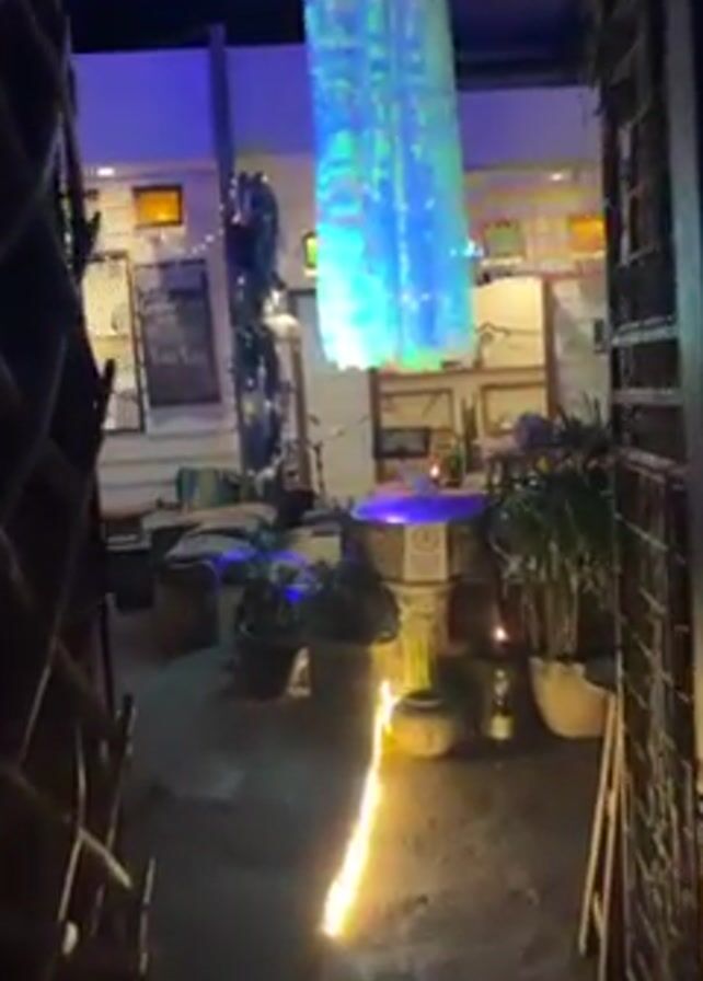 The camera pans left from a dimly lit open doorway to reveal a courtyard-style outdoor cafe or lounge. The space has a bohemian vibe, with low seating made from tires and pillows, and potted plants scattered around. A translucent, shimmering decoration hangs from the roof, illuminated with blue and green lights. There's a building in the background with multiple windows adorned with colored glass. The overall atmosphere is relaxed and inviting.