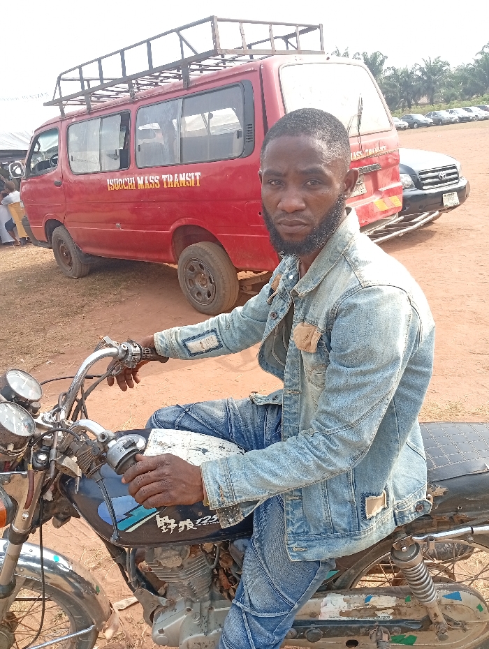 A man in a denim jacket and jeans sits on a black motorcycle in a dusty outdoor setting. Behind him, a red van with the words "ISUOCHI MASS TRANSIT" is parked. Other cars are visible in the background. The motorcycle appears older, and the man is looking directly at the camera. The overall scene suggests a casual, everyday moment.