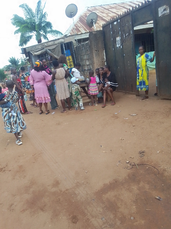 group of people, mostly women and children, gathered near a building in Ukwu-Abwa, Nigeria