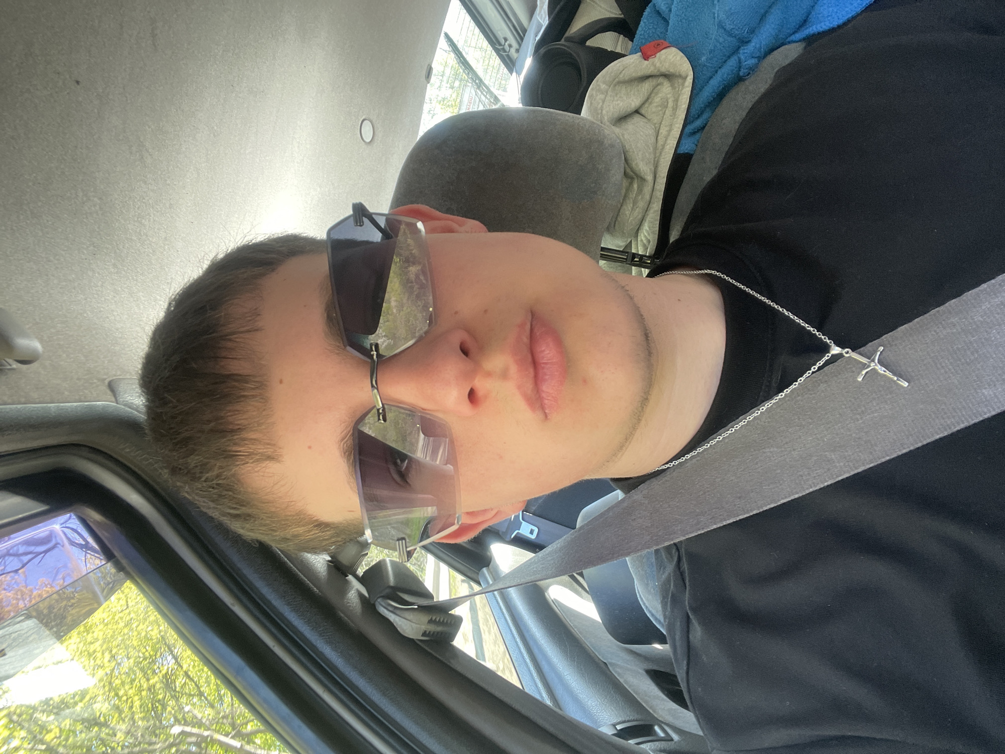 - "A young man wearing sunglasses and a silver cross necklace is seated in the driver's seat of a vehicle" by FM-ypobT2, licensed under CC BY 4.0