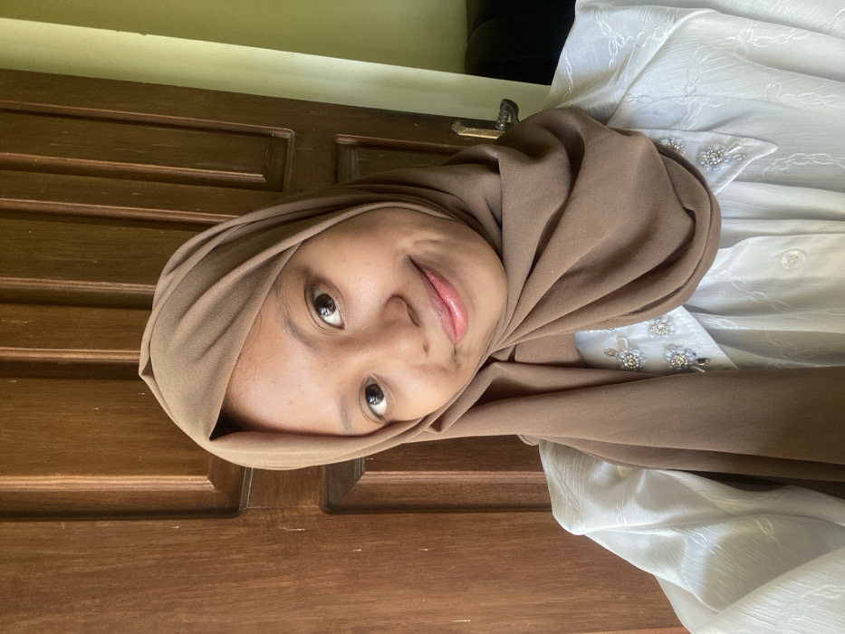 A young woman wearing a brown hijab and a light-colored, possibly white, shirt with embroidered or beaded details is captured in a portrait. She is smiling gently, and her face is slightly tilted towards the camera. The background includes a dark wooden door with paneling and a glimpse of a black object. The overall lighting is soft and natural.