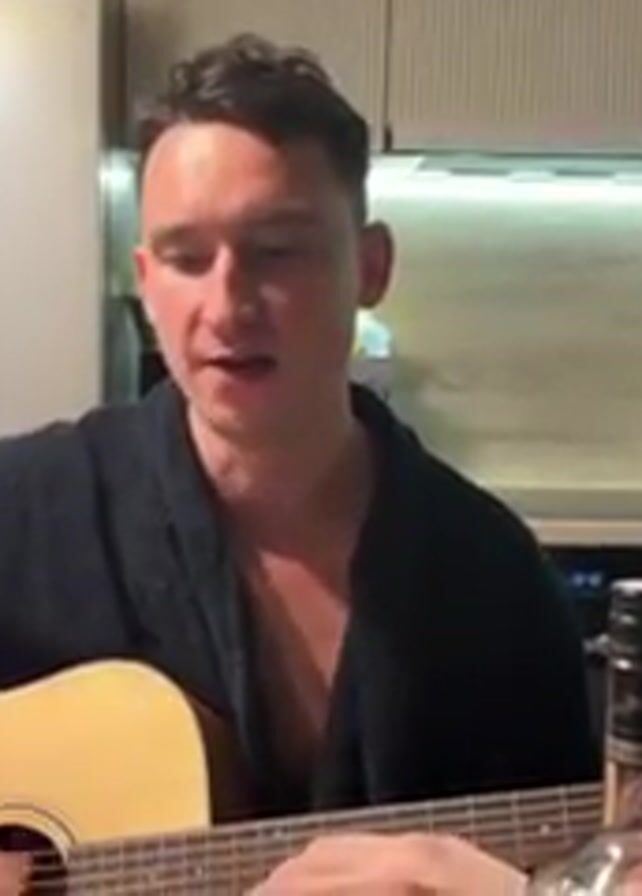 A man is sitting at a kitchen counter, playing a light-colored acoustic guitar, and singing