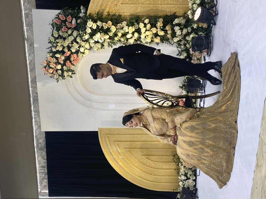 A wedding scene features a couple. The man, in a black suit with a gold bowtie, stands beside the seated woman. She wears a shimmering gold dress and head covering. They are positioned in front of a wedding backdrop decorated with white and pink flowers. The backdrop includes a white panel at the top and a gold semicircular design at the bottom, set against a black curtain. A decorative chair is placed behind the woman. Lighting equipment is also visible.