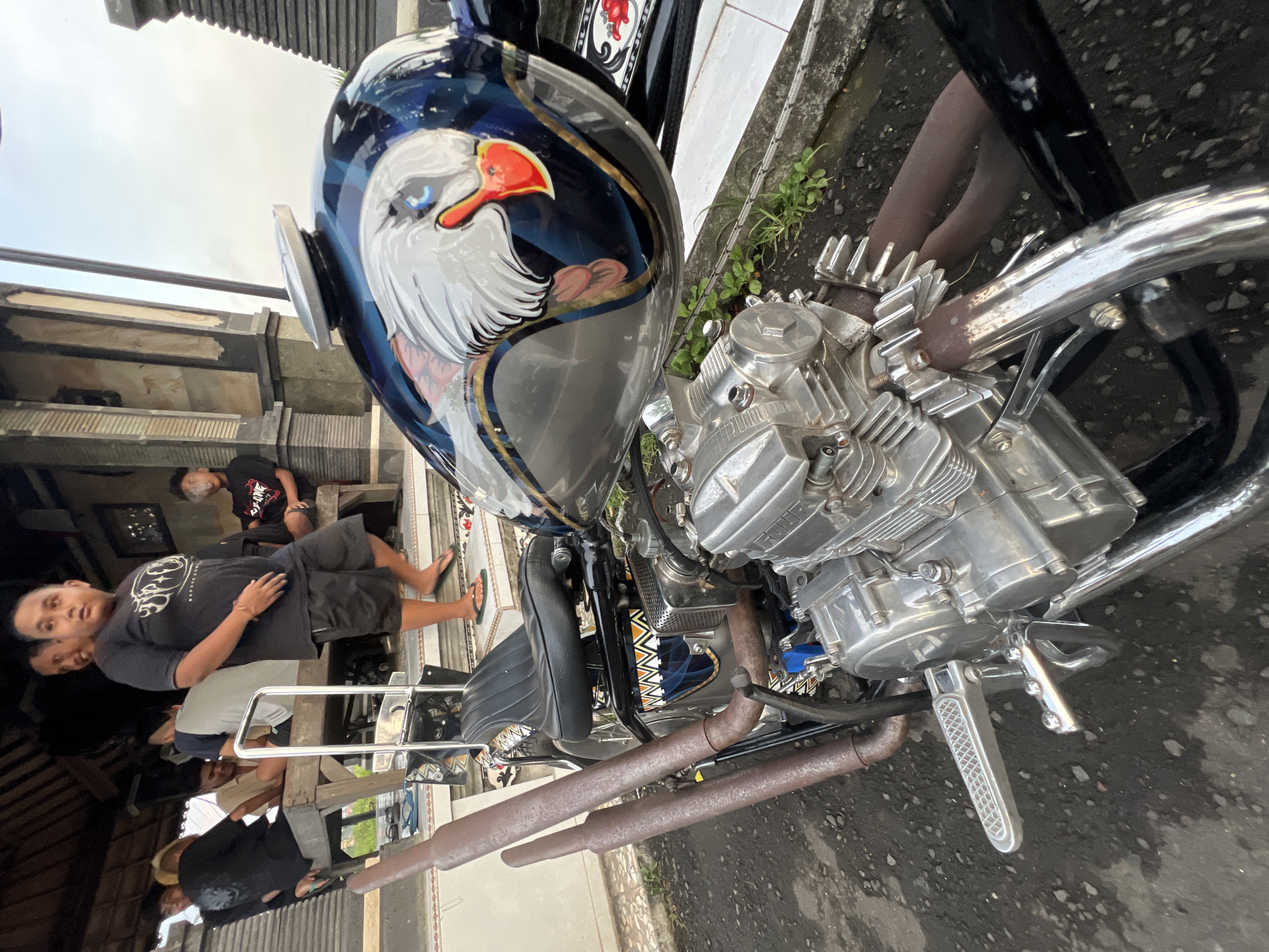 The image depicts an outdoor scene in Celuk, Indonesia, featuring a custom motorcycle in the foreground and a group of individuals on an elevated porch in the background. The motorcycle, positioned at a low angle, occupies the majority of the foreground. It features a custom fuel tank with an airbrushed design of a white eagle's head, predominantly blue, silver, and black. The engine block is exposed, appearing to be polished aluminum or chrome with cooling fins visible. Two large, rust-colored exhaust pipes extend horizontally along the right side of the motorcycle. The frame is black, supporting a single black seat and a chrome sissy bar. Chrome footpegs are visible on the left side of the engine. A section of the frame beneath the seat displays a black and white geometric pattern with blue accents. The motorcycle rests on a dark, possibly wet asphalt or dirt surface, with small patches of green vegetation visible near a concrete curb. Behind the motorcycle, on an elevated tiled porch with a patterned border, a group of six or more males is gathered. A heavier-set male, wearing a black t-shirt with a white graphic and black shorts, stands barefoot in dark flip-flops, looking slightly to his left. Behind him and to his right, another man smiles. Two men are seated on a wooden bench on the porch; one wears a light-colored shirt, and the other a black shirt. To the far right, another man in a black t-shirt is seated, exhaling smoke from his mouth. An additional individual is partially visible on the far left of the porch. The architectural background includes a traditional Indonesian-style building with dark pillars and a light-colored base, topped by a dark roof structure. To the right of the building, a tiered stone structure, typical of Indonesian temples or traditional architecture, is visible. The sky above is light and overcast.