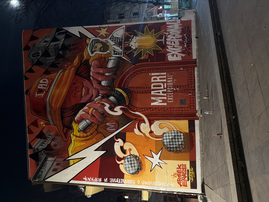 The image depicts a large, vibrant mural covering the entire exterior wall of a building in Plovdiv, Bulgaria, observed at night. The central figure of the mural is a stylized woman with a partly obscured face, wearing a red bucket hat inscribed with "I PLD" and a yellow jacket. She holds two silver spray paint cans, one in each hand, positioned as if actively spraying. Behind her, fragmented architectural elements resemble city buildings, one lighter and one darker, with decorative banners strung between them. To the right of the central figure, a smaller cartoon-style image of a bearded man with a houndstooth-patterned flat cap and waistcoat is visible. Below the woman's hands, a prominent red arched door-like structure is painted, bearing the white text "MADRÍ EXCEPCIONAL." To its right, a foamy glass of beer is depicted amidst yellow starbursts, accompanied by the graffiti-style word "EXCEPCIONAL." On the left side of the mural, a white lightning bolt graphic separates the upper and lower sections. Below it, text in Cyrillic script runs vertically, and at the bottom left, the signature "ARSEK ERASE" with "2025" below it is visible. Several stylized houndstooth-patterned spheres appear to float on the left side, along with a white star. The mural's base meets a paved sidewalk, which includes a raised step in the immediate foreground. Scattered on this sidewalk are several items of litter: a clear plastic bottle, a green-capped plastic bottle, and a red cylindrical object. The scene is illuminated by artificial light sources, casting shadows and highlighting the mural's colors against the dark night sky, where a partial moon is visible in the upper right quadrant. Bare tree branches are discernible in the dark background to the right of the building.