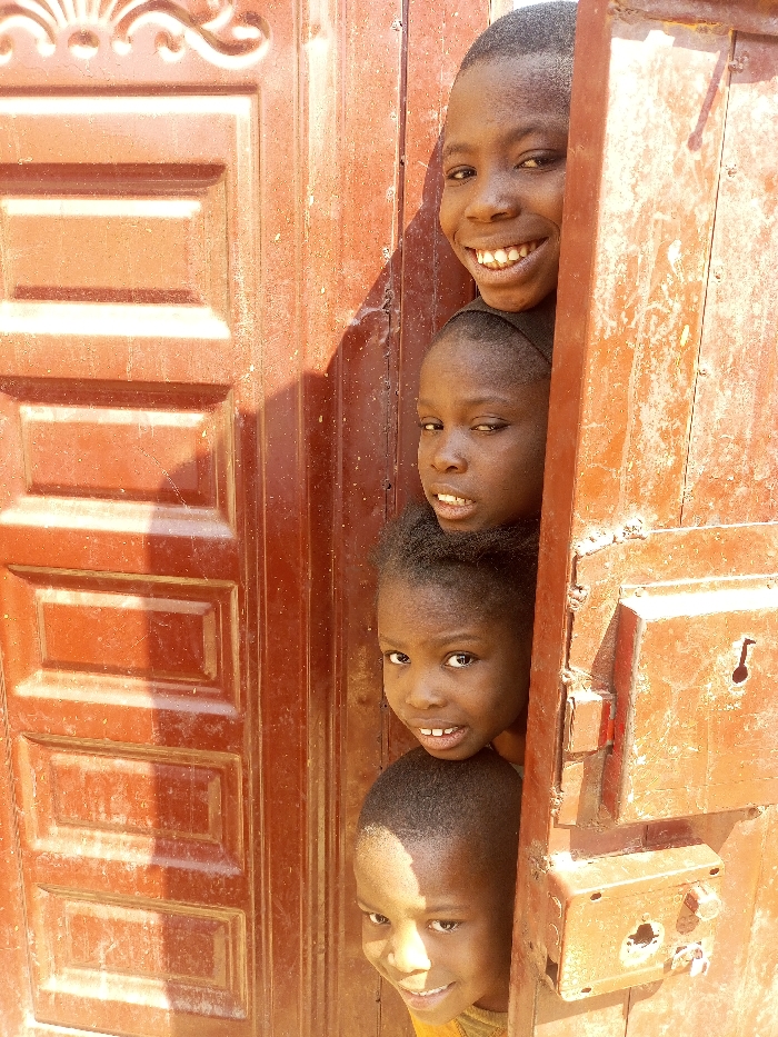 The image displays four children, appearing to be between approximately 5 and 10 years of age, vertically stacked and peeking from behind the slightly ajar right edge of a reddish-brown door. This scene is located in Tempure, Nigeria. The door itself shows signs of wear, featuring a recessed panel design on its left side and a visible keyhole with a surface-mounted lock mechanism on its right edge. The uppermost child is smiling broadly, revealing teeth, and looks directly at the viewer. The second child from the top exhibits a neutral or slight smile. The third child from the top has a slight smile, and the bottom child is also smiling, looking slightly upwards towards the viewer. All children have dark skin and short, dark hair. The scene is brightly lit by direct sunlight from the front-right, casting distinct shadows. No other subjects or actions are present.