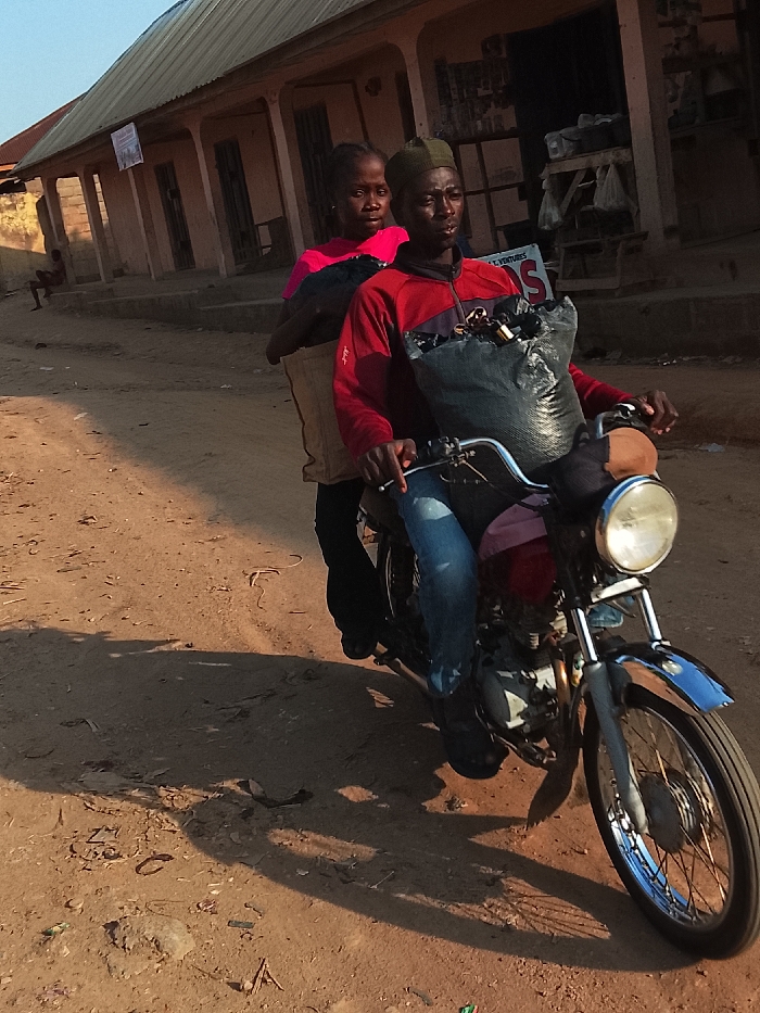 Two people ride a motorcycle on a dirt road. The driver, wearing a red shirt, jeans, and a hat, has a black bag filled with objects strapped to the front. The passenger, in a pink shirt, sits behind. They travel on a road lined with buildings and a figure is sitting outside of one. The lighting suggests it is early morning or late afternoon. The surroundings appear rural.