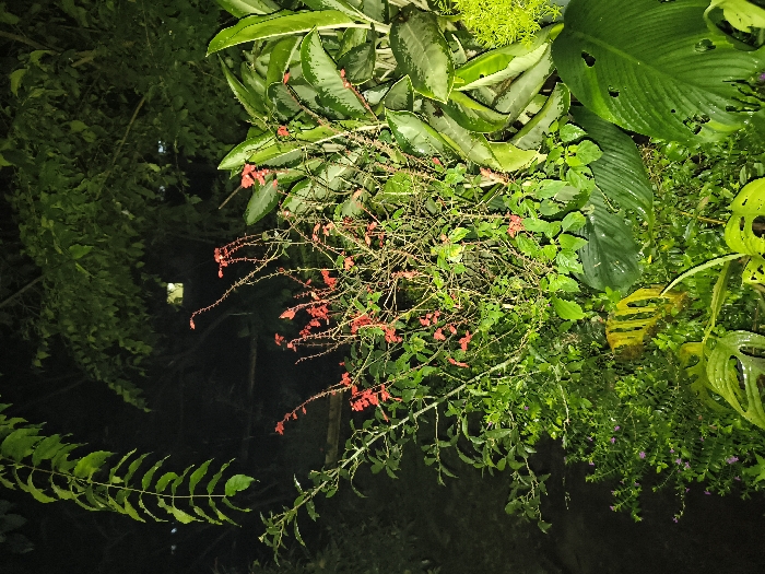 The image depicts a dense botanical scene at night, located in Tarqumiyah, Palestinian Territory. The foreground and midground are dominated by various green plant species illuminated by an unseen artificial light source, while the background remains dark. A central subject is a shrub with numerous small, bright red tubular flowers or buds on slender, thorny branches. To the right, several large, broad, green leaves are visible, some appearing glossy and possibly wet. One prominent large green leaf in the lower right foreground exhibits multiple irregular holes. In the lower-central area, a plant with distinctive yellow-green, fenestrated leaves is present. A long, drooping vine with numerous lighter green, ovate leaves hangs vertically on the far left. Smaller, dark green foliage and other plant structures fill the lower left and mid-ground. In the dark background, a faint rectangular light source, possibly a distant window, is visible amidst obscured tree canopies. No people or animals are present.