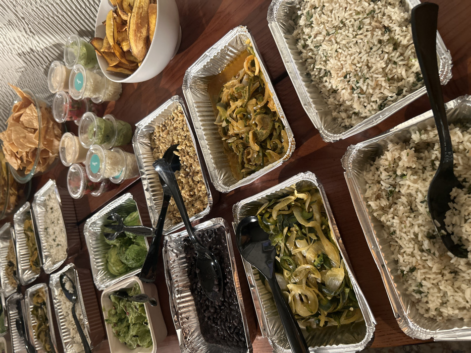 A catering-style food spread is arranged on a dark, polished wooden surface in Beverly Hills, United States. The scene is static, devoid of people or active engagement. Numerous rectangular aluminum foil trays contain various food items. Visible contents include multiple trays of black beans, several trays of white rice with green herbs, multiple trays of sautéed sliced onions and green peppers/chiles (some in a yellowish liquid), and several trays of light brown, textured grain or nut mixture (possibly roasted corn). A white rectangular container holds green guacamole, and another aluminum tray contains green sliced vegetables, possibly brussels sprouts. In the upper right quadrant, a large clear glass bowl is filled with light brown tortilla chips. Adjacent to this, a white ceramic bowl contains numerous fried plantains or banana chips. Several small, clear plastic cups with lids are present, containing various condiments such as light-colored sauces, red chopped vegetables (salsa), green guacamole or sauce, and white shredded cheese. Some of these cups feature small, light blue circular labels. Multiple black serving spoons are placed within various food containers for serving. The background features a vertical textured, light-colored wall or partition.