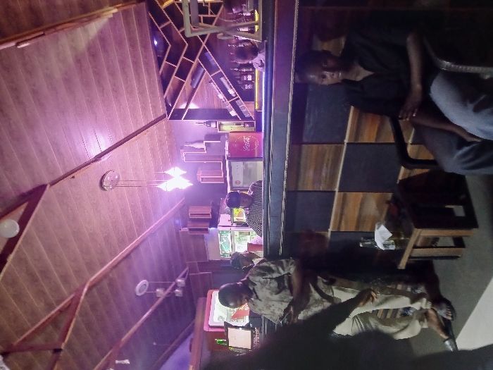 The photo depicts an interior scene, likely a bar or restaurant, with wooden-paneled ceilings and geometric shelving