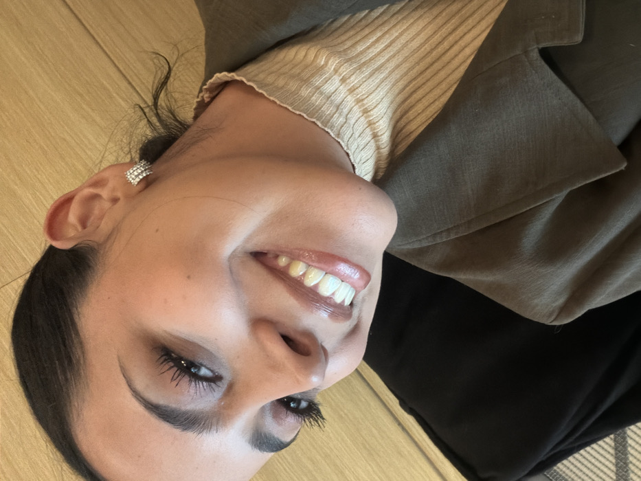 A woman smiles, showing her teeth. She has on a cream-colored, ribbed turtleneck sweater with a dark, possibly olive green blazer. Her hair is dark and pulled back, and she has a sparkling earring on her left ear. She has dark eyebrows and eyelashes, and her lips are glossed. The background appears to be a wood floor and a black article of clothing is partially visible. The image is oriented sideways.