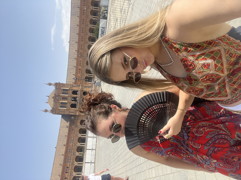 Two women pose for a selfie against the backdrop of a large building with arched windows and towers. The woman in the foreground holds a black hand fan. Both women wear sunglasses. The woman on the left wears a red dress and has her hair in a bun. The woman on the right wears a patterned tank top and a necklace. A man lies on the ground in the background. The day appears sunny.