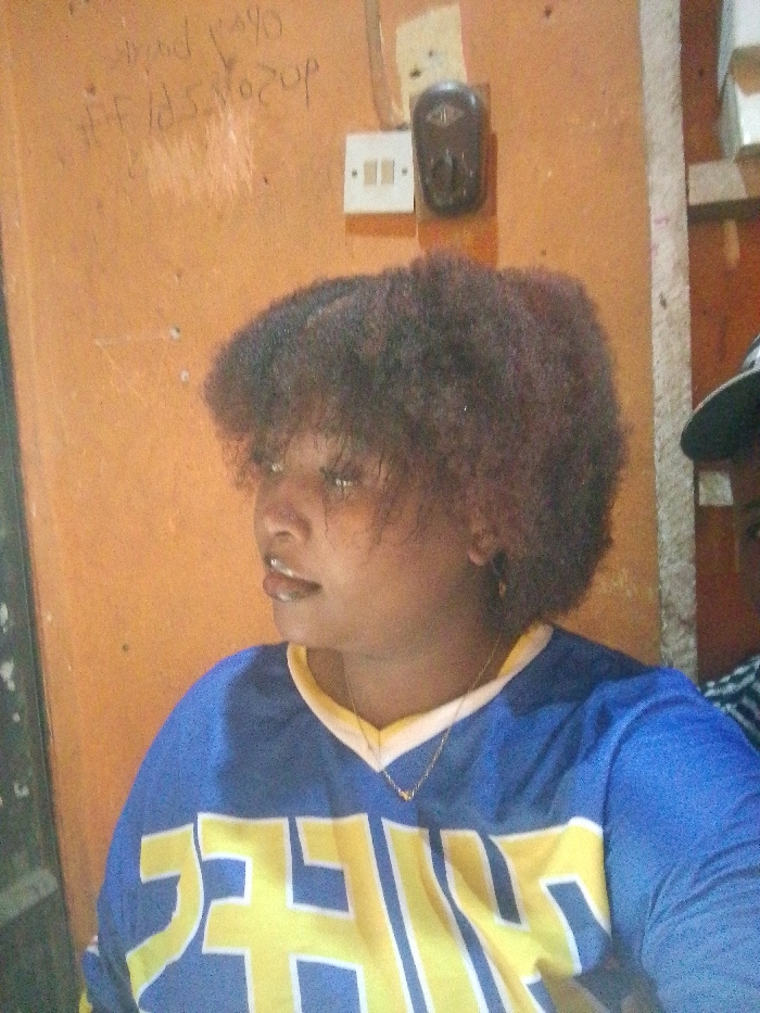 An image taken in Egbagu, Nigeria, depicts a female subject in a partial profile view, facing left. She has dark, voluminous, textured hair, possibly with a reddish tint. Her lips are slightly parted and appear glossy. She wears a blue, long-sleeved shirt with a yellow, possibly graphic or lettered design across the chest, and a thin gold chain with a small pendant around her neck. To the far right, a second individual is partially visible, wearing a dark cap and a striped shirt. The background consists of an orange-toned wall with a white light switch featuring two toggles and a dark-colored electrical outlet mounted above it. Indistinct white markings, possibly graffiti or reversed text, are present on the upper left portion of the wall.