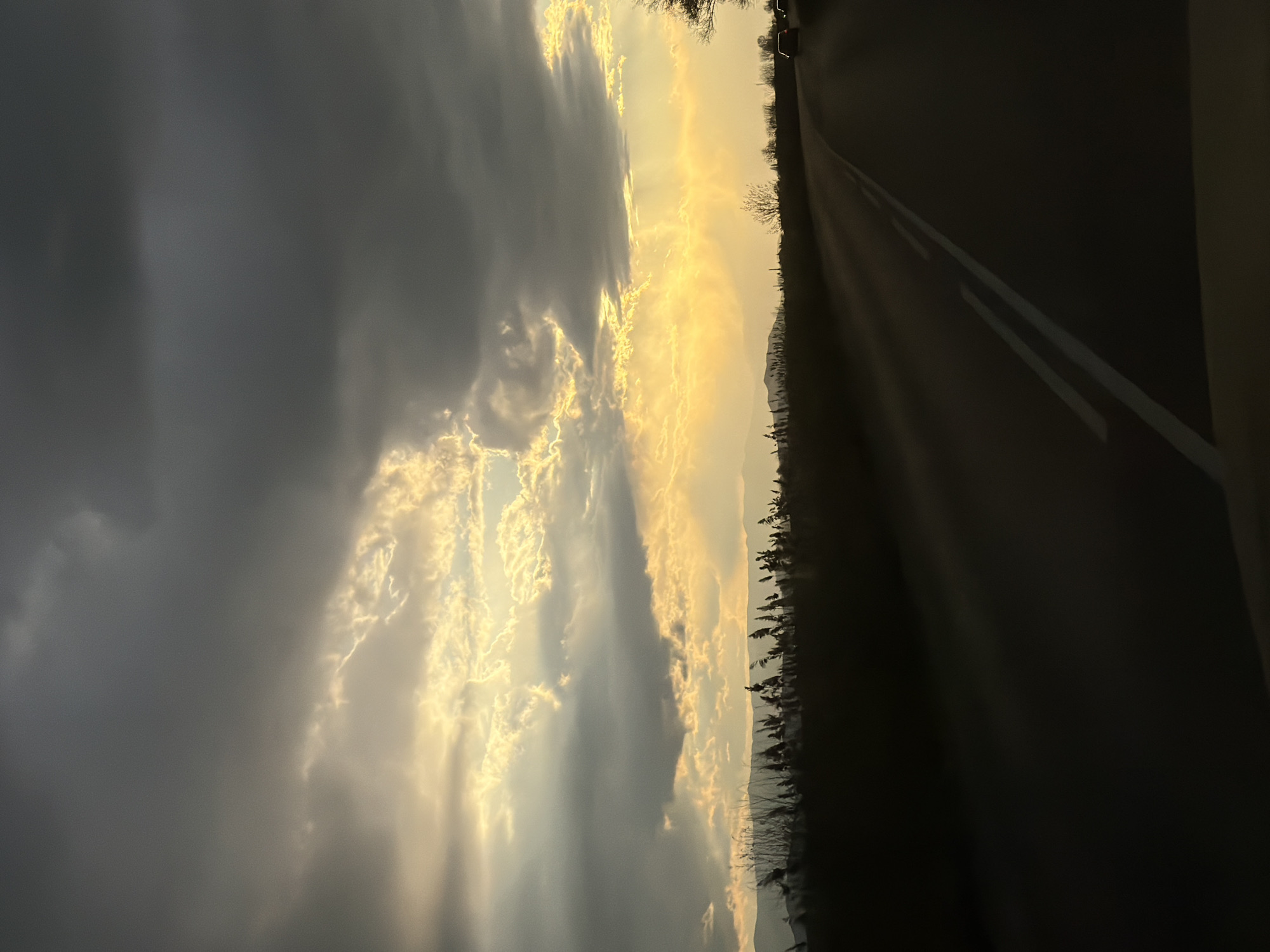 The image depicts a landscape at dusk, possibly located in Kadievo, Bulgaria. On the right side, a dark asphalt road with white dividing lines is visible. A line of silhouetted trees and shrubs separates the road from the sky. The sky itself is a mix of dark gray clouds and patches of golden light, likely from the setting sun. The light is filtering through the clouds, creating a dramatic effect. There are no people visible in the image.