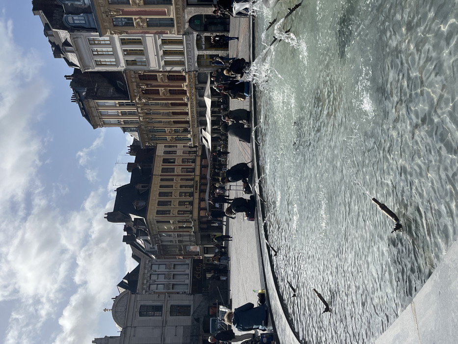 The image depicts an active public square, identified as Place du Général de Gaulle (Grand Place) in Lille, France, under a partly cloudy daytime sky. In the foreground, a semi-circular, light-grey concrete fountain basin occupies the lower left and center. Clear water inside the basin is agitated by multiple bronze-colored, upward-angled nozzles spraying water, creating white foam and ripples. Small dark fragments, possibly organic debris, float within the water. Immediately behind the fountain, a group of approximately eight individuals is seated or crouched along the basin's edge or on the surrounding pavement. One person on the far left wears a blue jacket and sits near a green bottle. Two individuals to their right are crouched, with dark bags beside them. Their attire is casual, primarily dark colors. The midground features a wide, open paved square with numerous pedestrians walking in various directions. These individuals are distant and appear as indistinct figures; no specific interactions are clearly discernible. The background is dominated by a perimeter of multi-story buildings exhibiting various architectural styles typical of European cities. On the far left, a grey building with a dark roof and a decorative cross finial is visible. Further right, a light-colored building displays "L'ARSENAL" on its facade, indicating a brasserie with outdoor seating under white awnings. Continuing to the right, a series of ornate buildings with decorative facades, columns, and multiple windows are present, some housing ground-level shops, including one identified as "Foot Locker." The sky overhead shows patches of blue interspersed with white clouds, and sunlight casts visible shadows across the square and buildings.