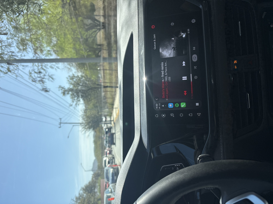 The image displays a daytime view from within a vehicle experiencing traffic congestion in San Pedro Garza García, Mexico. The vehicle's dark gray dashboard and a section of the steering wheel are visible in the foreground. An infotainment screen, partially obscured by sun glare, displays a music player interface. The screen shows the time as 11:30 and indicates a 5G connection. The track "Beto's Horns - fred remix" by "Fred again..., GA7RIEL & Paco Am..." is playing via USB, at 1 minute and 13 seconds into the track. Through the windshield, a line of various vehicles, including sedans and SUVs, is stationary or moving slowly on a multi-lane road under a clear blue sky. Orange traffic cones are visible on the left side of the road. Utility poles with multiple overhead power lines run parallel to the road on both sides, accompanied by streetlights. Sparse green vegetation, including trees and shrubs, lines the roadside, with a wire fence present on the right. Distant mountains are visible on the horizon. Bright sunlight illuminates the scene, creating reflections on the vehicle's interior surfaces.