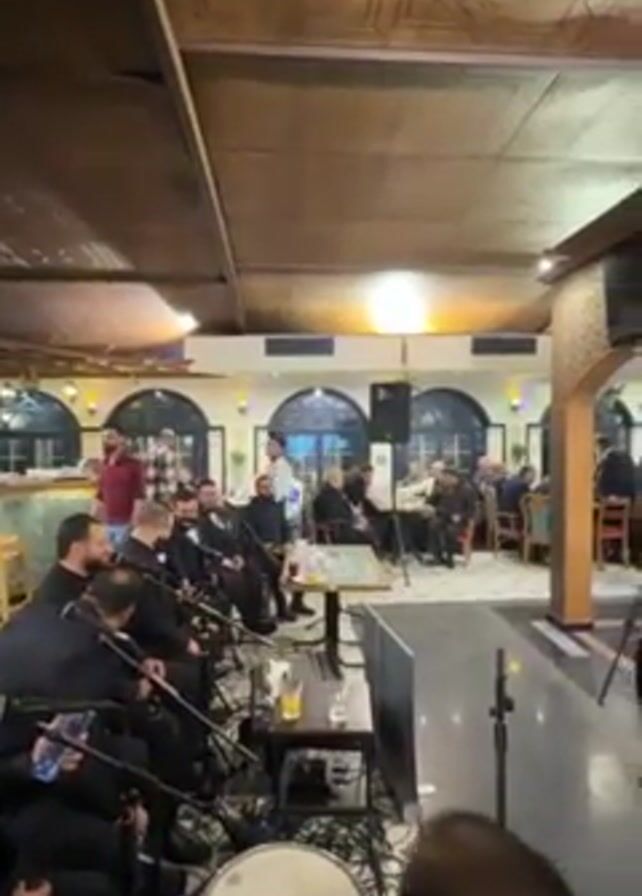 The video captures a scene in an ornate restaurant or event space, with a live musical performance underway. A group of men, dressed in black suits, are seated and appear to be part of the band or choir, each with a microphone in front of them. A drummer sits to the forefront, playing a snare drum. A standing figure, presumably the singer or speaker, is positioned center-stage, addressing the audience. The audience consists of men, seated at tables, engaging with the performance. The ambiance is warm, with decorative lighting and intricate ceiling designs. There is a sound system visible near the performers. The camera pans slightly to offer a broader view of the venue, showcasing the interior design, including arched doorways and patterned walls. People move around in the background, suggesting a dynamic and social atmosphere.