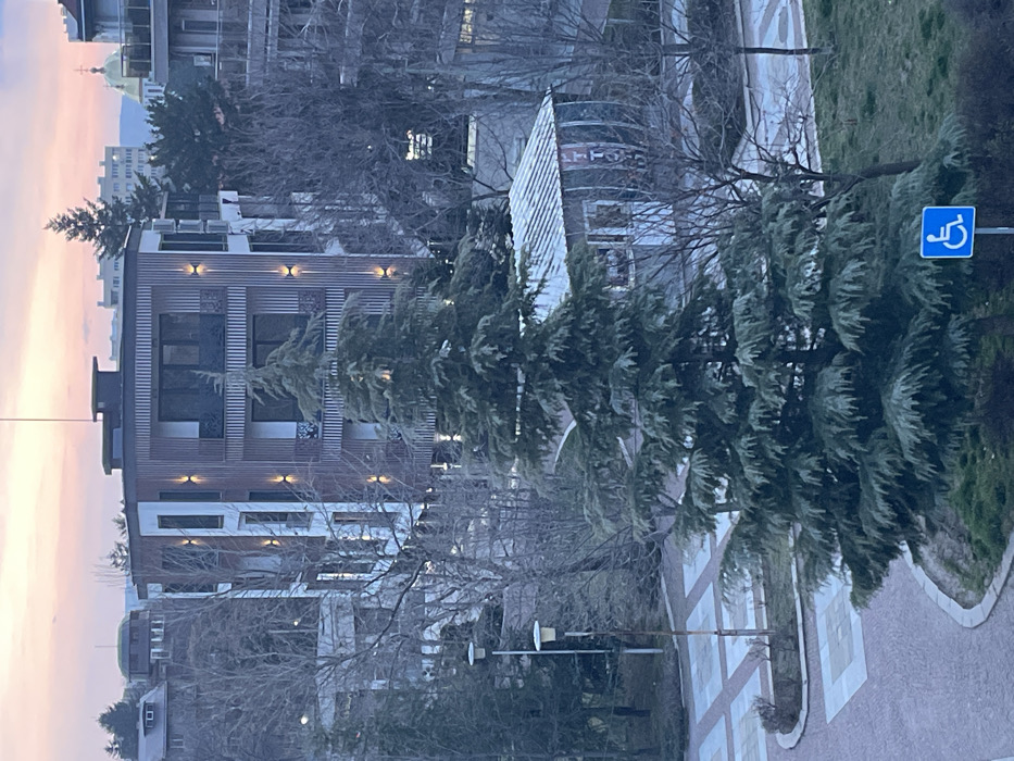 This image captures an urban scene in Dupnitsa, Bulgaria, during twilight or dawn hours. A large, dark green coniferous evergreen tree stands prominently in the central foreground. To the left of this tree, a paved pedestrian area is visible, featuring a patterned surface of light and dark square tiles, bordered by a concrete curb and some low-lying shrubbery. Two pole-mounted streetlights, each with dual lamp heads, rise from this paved area. Adjacent to the base of the large evergreen tree, on a small grassy patch, a blue sign with the international symbol of access (wheelchair symbol) is mounted on a pole. In the mid-ground, behind the evergreen tree, a modern, multi-story building with a distinctive facade is present. It features a combination of light-colored flat panels and darker, vertically paneled sections, numerous dark-framed windows, and balconies with dark metal railings. Multiple warm-toned, wall-mounted exterior lights illuminate its facade. To the right of the main evergreen tree, partially obscured by bare deciduous trees, is a small, white, rectangular kiosk-like structure with a corrugated metal roof and glass sides displaying red lettering. The background reveals additional urban structures, including residential buildings and, on the far right, a building featuring a golden-domed roof. Numerous deciduous trees, devoid of leaves, are scattered throughout the scene, suggesting a winter or early spring setting. The sky displays soft gradients of pink and light blue. No individuals or active subjects are visible within the frame.