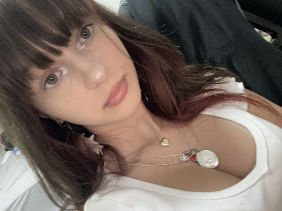 A close-up image depicts a female subject from the upper torso upwards, positioned centrally, looking directly at the viewer. She has long, dark brown hair with reddish highlights and bangs covering her forehead. Her eyes are light brown. The subject is wearing a white, ribbed v-neck top. Multiple necklaces are visible: a thin chain with a small gold-colored heart pendant, and a thicker chain bearing a large, round, silver-colored locket, alongside a smaller red and silver-colored charm. A light-colored, star-shaped or spiky earring is partially visible on the subject's left ear. The background is out of focus, showing indistinct light-colored fabric in the upper left and dark fabric to the right, consistent with an indoor setting. The specific location within the city of Raanana, Israel, is not discernible from the visual information provided.