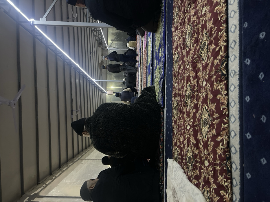 The image presents an interior view of a prayer hall or mosque located in Karmana, Uzbekistan. Approximately 15 to 20 adult males are visible, mostly seated on patterned prayer mats, with their backs to the camera, indicating they are facing a common direction. Most individuals are dressed in dark winter attire, including jackets and hats such as black beanies or kufis. In the immediate foreground, a prominent burgundy prayer mat with gold and black floral patterns is visible, alongside a segment of a white patterned textile. Beyond this, rows of blue and green patterned prayer mats extend across the floor. The ceiling structure features exposed metal beams supporting a light-colored corrugated or panel roof. Multiple white ceiling fans are mounted, and long, linear LED strip lights illuminate the space along the beams. In the mid-ground, two men stand upright, appearing to be in conversation, while others remain seated in various states of repose or prayer. The environment is well-lit and appears to be a functional space for communal gathering.