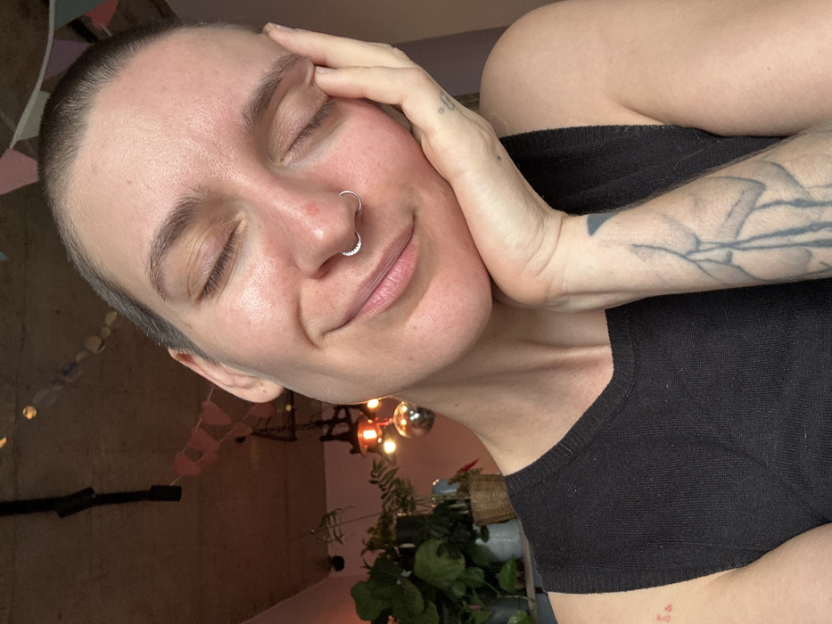 A person with a shaved head is shown in a close-up shot, with their eyes closed and a serene expression. They are wearing a black tank top. Their left hand is resting on their face. They have a nose ring and tattoos on their left arm and chest. The background includes plants, a light fixture, and a wall with decorations. The photo is taken at a slightly tilted angle.