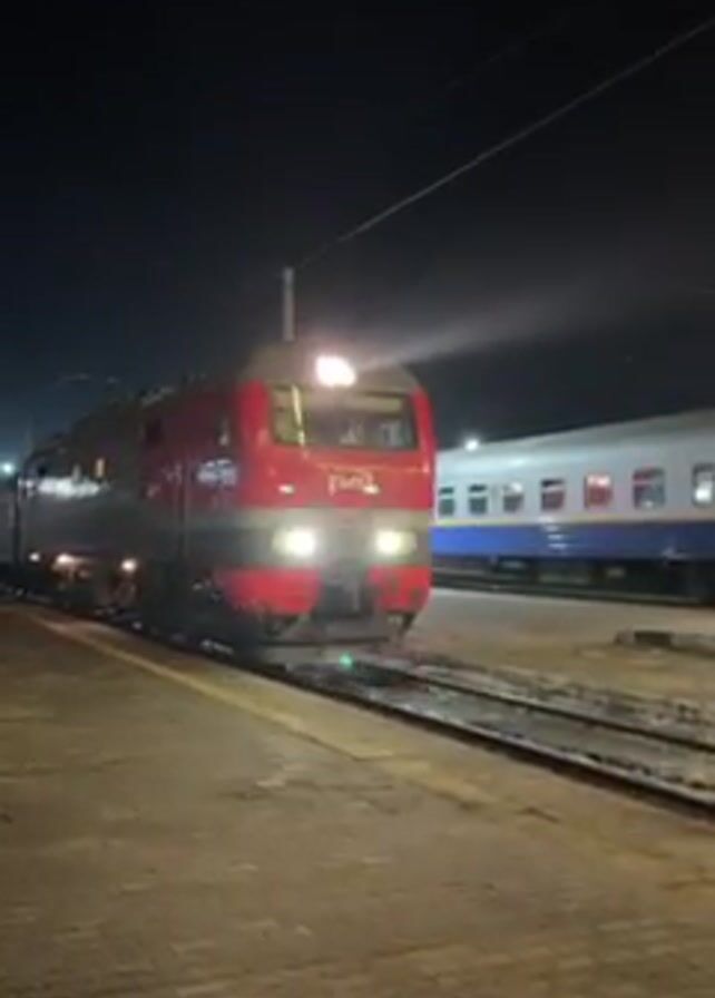 At night, a red and gray electric train locomotive arrives at a station platform, pulling a passenger train. The train, with the Russian Railways logo, moves along the tracks, its headlight illuminating the scene. Another train, painted blue and white, is parked on a nearby track. The platform is paved with rectangular blocks. The night sky is visible in the background.