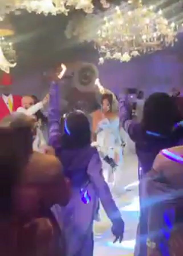 A group of people are gathered in an ornately decorated room, illuminated by chandeliers and colored lights