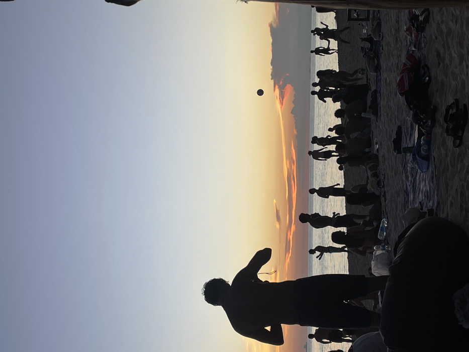 The image depicts a beach scene at sunset in Baan Sri Thanu, Thailand. The sky is a gradient of blue transitioning to orange and yellow at the horizon, with horizontal clouds displaying orange and red hues. The sea reflects the sky's light, appearing lighter blue. In the foreground, the silhouette of a shirtless individual with short hair stands facing away from the viewer, appearing to adjust something around their neck or chest. To their left, part of a dark, rounded object, possibly a beanbag or bag, is visible on the sand. On the sandy beach, various personal items such as towels, sandals, bottles, and bags are scattered. Several individuals are seated or lounging on the sand in the midground, also in silhouette. Further back, closer to the water's edge, numerous people are engaged in activities. A group on the right is playing volleyball, with a dark ball visible in mid-air against the colorful sky. Other individuals stand or walk along the shoreline. All figures are rendered as dark silhouettes against the bright sunset, obscuring specific features and attire. A vertical dark object, possibly a wooden post or part of a structure, is visible on the far right edge of the frame.