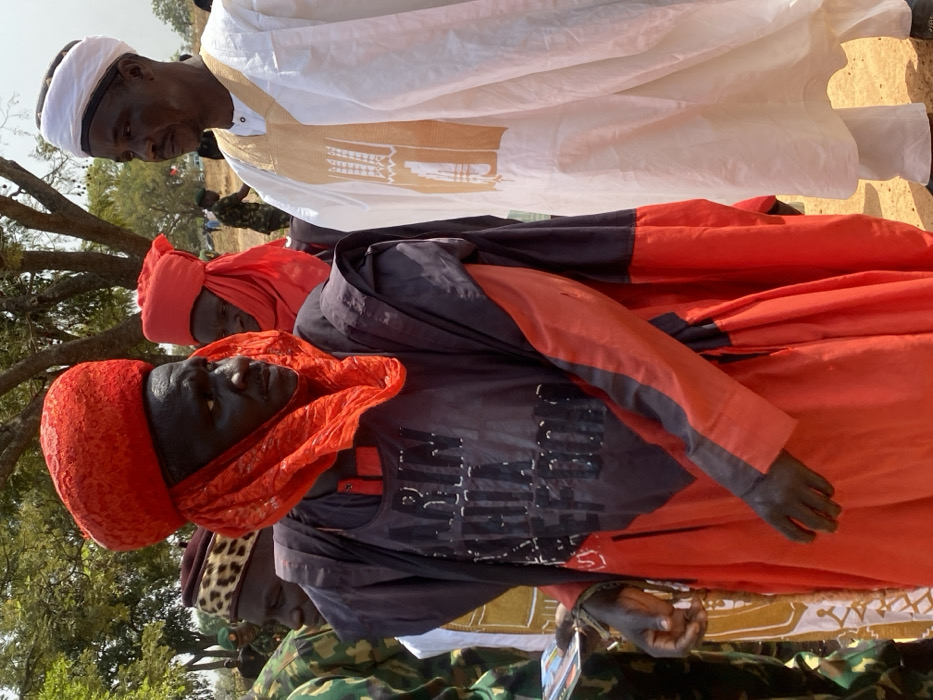 The scene depicts an outdoor gathering in Kachia, Nigeria, under bright daylight conditions