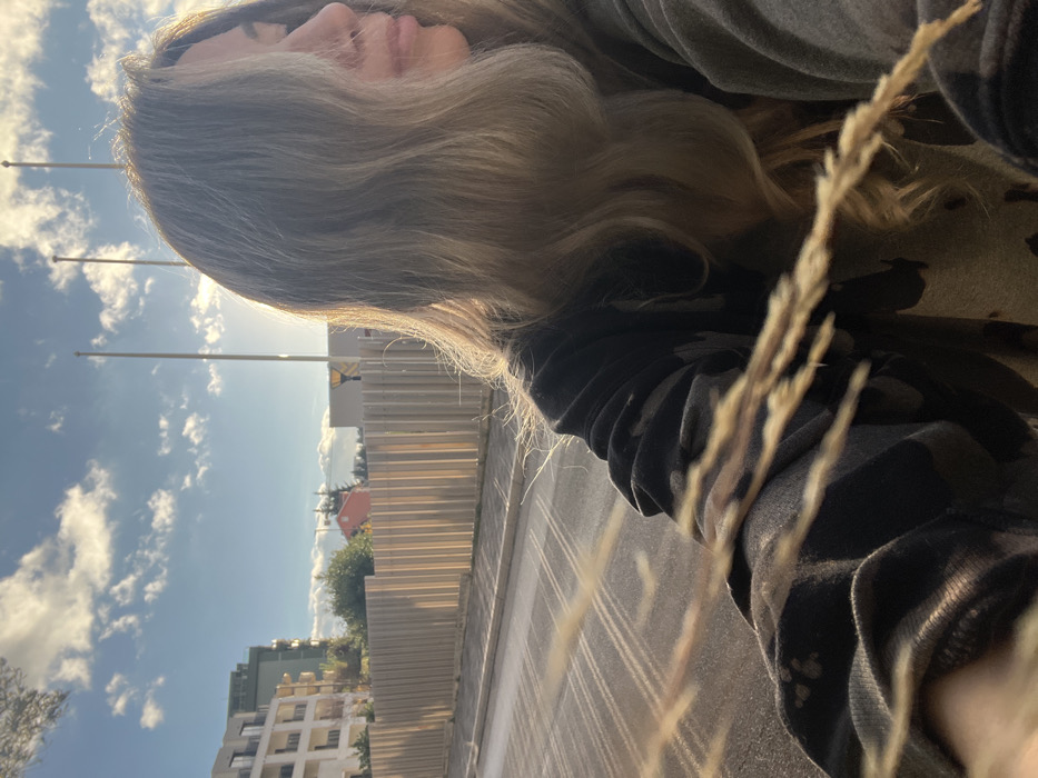 This image depicts an outdoor scene in Pržno, Montenegro, under a partly cloudy sky with bright, low-angle sunlight creating strong backlighting. A female subject is positioned in the right foreground, visible in profile facing towards the right. She has long, wavy blonde hair, heavily illuminated by the sun, and wears a dark, patterned long-sleeved top. Her right arm is visible, extending towards the lower left. A single strand of dried, light-colored grass runs diagonally across the lower left portion of the frame. In the midground, a paved surface is visible, bordered by a light-colored corrugated metal fence. Beyond the fence, several buildings are present, including a multi-story, light-colored building on the far left and a red-roofed structure. Three tall, unflagged flagpoles stand vertically in the background against the blue sky.