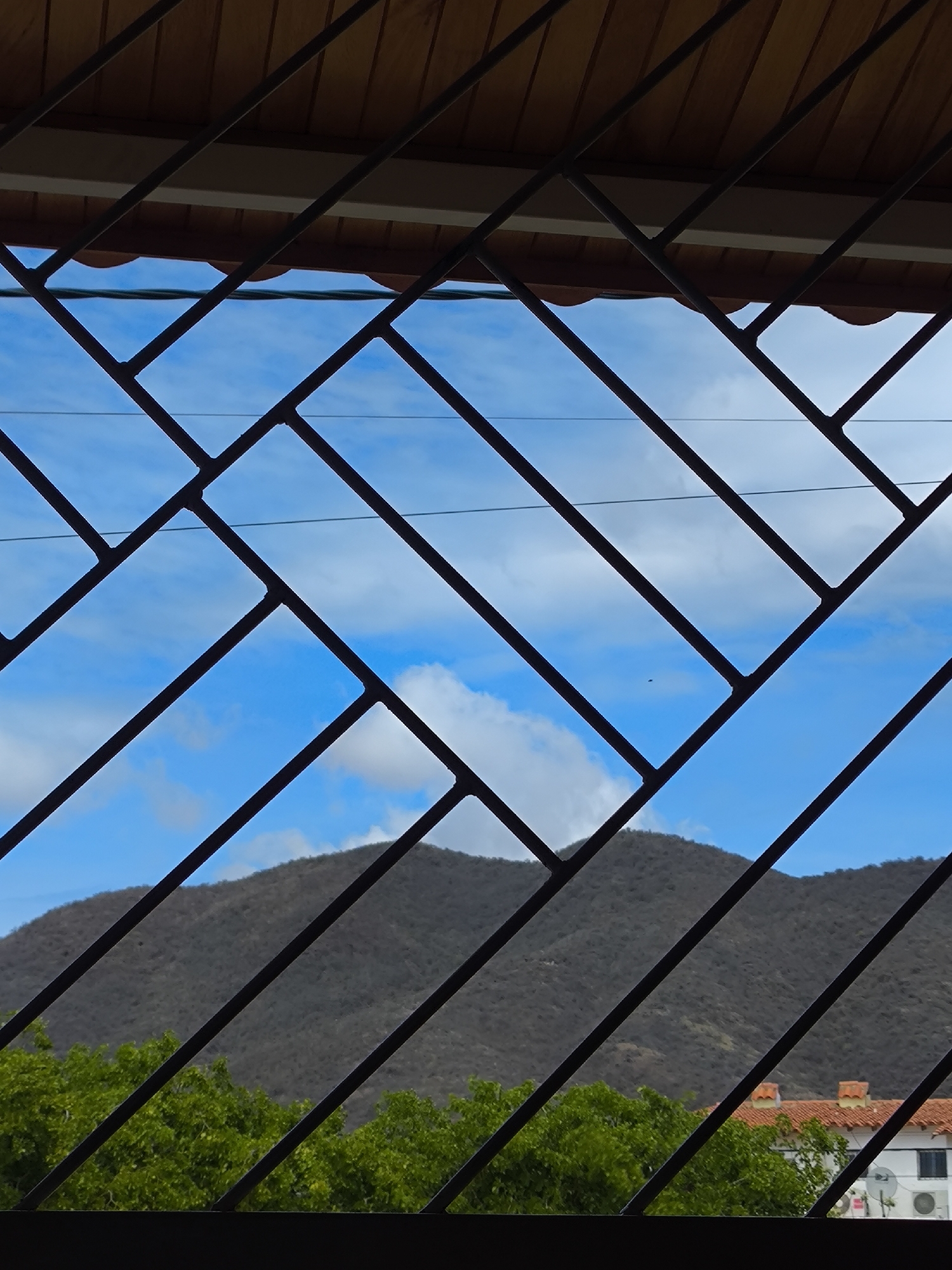 view from behind a black metal security gate. Beyond the gate, a landscape is visible, including a mountain, green trees, a building with a red-tiled roof and a cloudy blue sky. Two power lines are stretched across the sky. It is possible this image was taken in La Guardia, Venezuela.