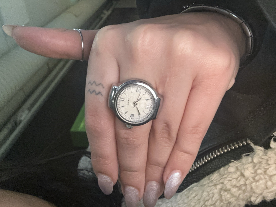 A close-up image displays a left human hand, palm-down, slightly elevated and angled. The hand exhibits light-toned skin, with all visible fingernails painted in a light, shimmery, possibly pearlescent polish, shaped in an oval or almond style. A silver-toned ring watch, featuring a white dial with black Roman numerals (III, VI, IX, XII) and stick markers, is worn on the middle finger. The brand name "ZIMA" is visible on the watch face. A crown protrudes from the right side of the watch case. Three wavy line tattoos are present on the dorsal surface of the index finger, proximal to the first knuckle. A thin, plain silver-toned band ring encircles the distal phalanx of the thumb. A segmented, silver-toned bracelet is partially visible on the wrist. The hand is wearing a black garment, identifiable by a silver zipper on the lower left. Underneath the black garment, a textured, off-white, possibly fleece or sherpa material is apparent. The background is out of focus, appearing dark and indistinct, with a faint green area in the upper left corner. No specific environmental or architectural features identifiable as Lahti, Finland, are discernible within the image.