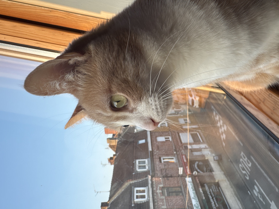 - "A domestic cat, predominantly ginger with white fur on its muzzle, chest, and chin, is positioned indoors at a window, its head turned left and gaze directed outward" by FM-xTDQG2, licensed under CC BY 4.0