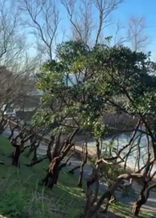 The camera pans from left to right, revealing a scenic view of a coastline. In the foreground, there is a green grassy slope dotted with trees. Some of the trees are bare, while others have green foliage. A gray stone wall runs along the bottom of the frame. As the camera pans, the view opens up to reveal the ocean. The water is choppy, with white waves crashing against the rocky shore. A tan-colored cliff juts out into the water in the distance. The sky is bright blue, and the sun is shining, creating a pleasant and clear day. A narrow road runs parallel to the coastline.