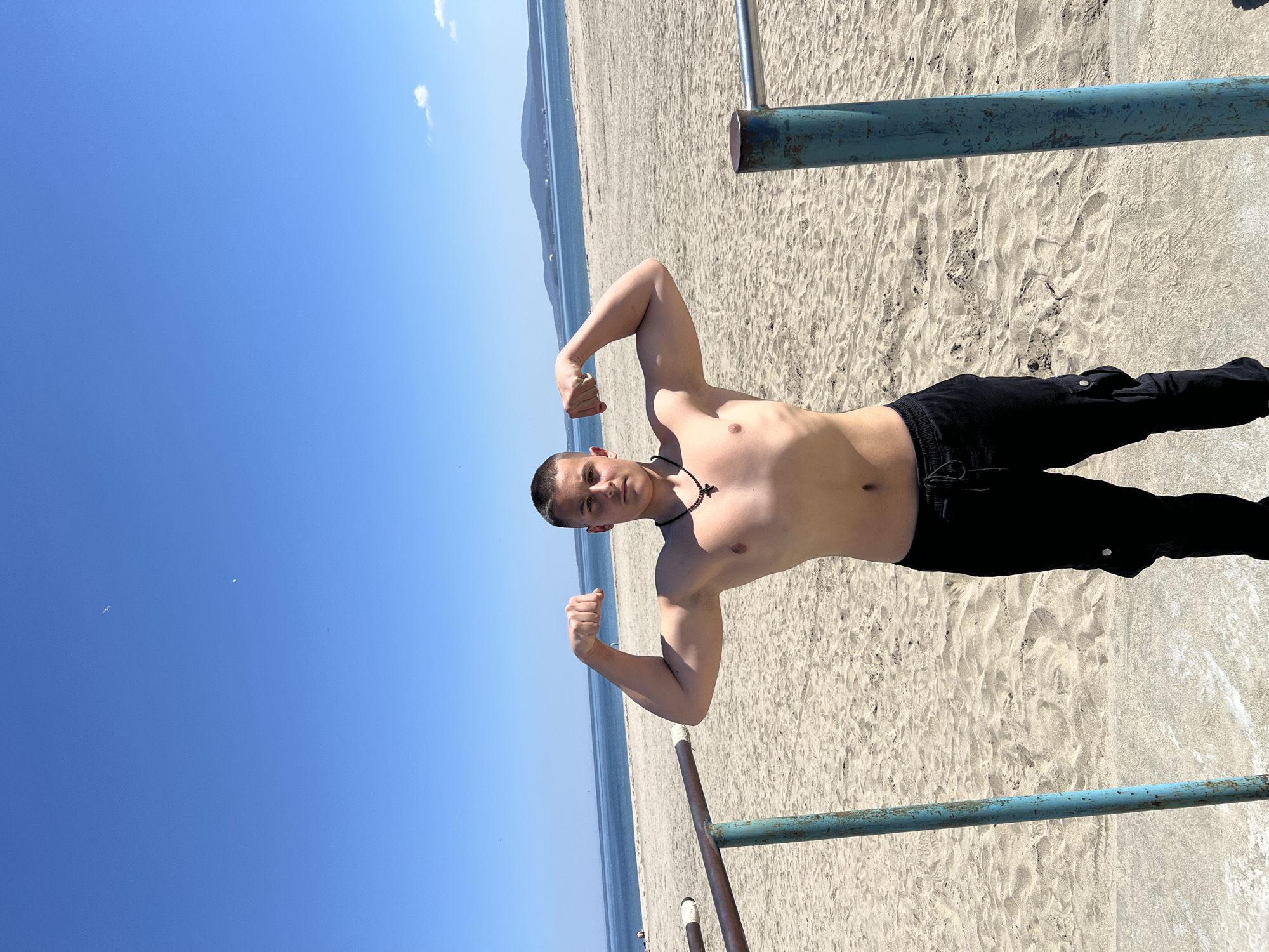 A shirtless man in black pants poses on a sandy beach, flexing his biceps