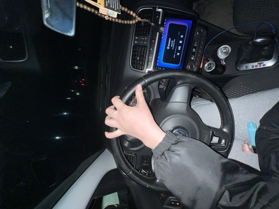 Inside a car, a person's hand rests on the steering wheel, obscuring the VW logo. The dashboard displays a modern infotainment system with music controls and Bluetooth connectivity. Two partially visible aluminum cans sit near the gear shift. The passenger seat has a glimpse of gray fabric and a blue pacifier. Outside, the night is dark with blurry lights, as seen through the windshield and side mirror. A string of wooden beads and a hanging tag dangle from the rearview mirror.