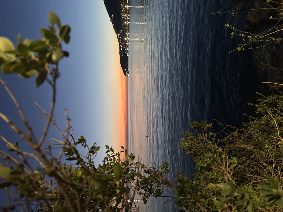 The image displays a coastal scene at dusk in Budva, Montenegro, observed from an elevated perspective. The immediate foreground features out-of-focus green foliage and dark branches of a shrub or tree, partially illuminated by an artificial light source originating from below or the left. The midground consists of the dark blue water of the Adriatic Sea, showing minor ripples and reflecting a gradient of light from the sky and distant sources. A small, dark, indistinct object is present on the water's surface in the left-center. The background horizon is characterized by a sunset, transitioning from dark blue in the upper sky to orange, pink, and yellow hues directly above the water. To the right, a dark, elevated landmass, indicative of a hillside, is extensively covered with numerous illuminated artificial lights from buildings, which project visible vertical reflections onto the water. No human figures or specific actions are discernible within the frame.