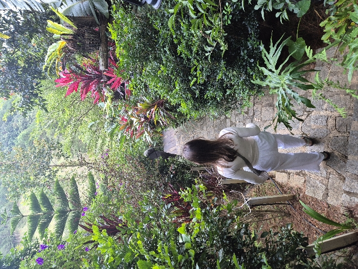 A woman in white walks on a stone path lined with lush, vibrant greenery. Various plants, including ferns, red bromeliads, and verdant bushes, flank the walkway. A distant, hazy landscape is visible beyond the foliage, suggesting a garden or park setting on a hillside. The perspective is from slightly above, angled downwards, capturing the path and the woman's progress through the verdant scene.