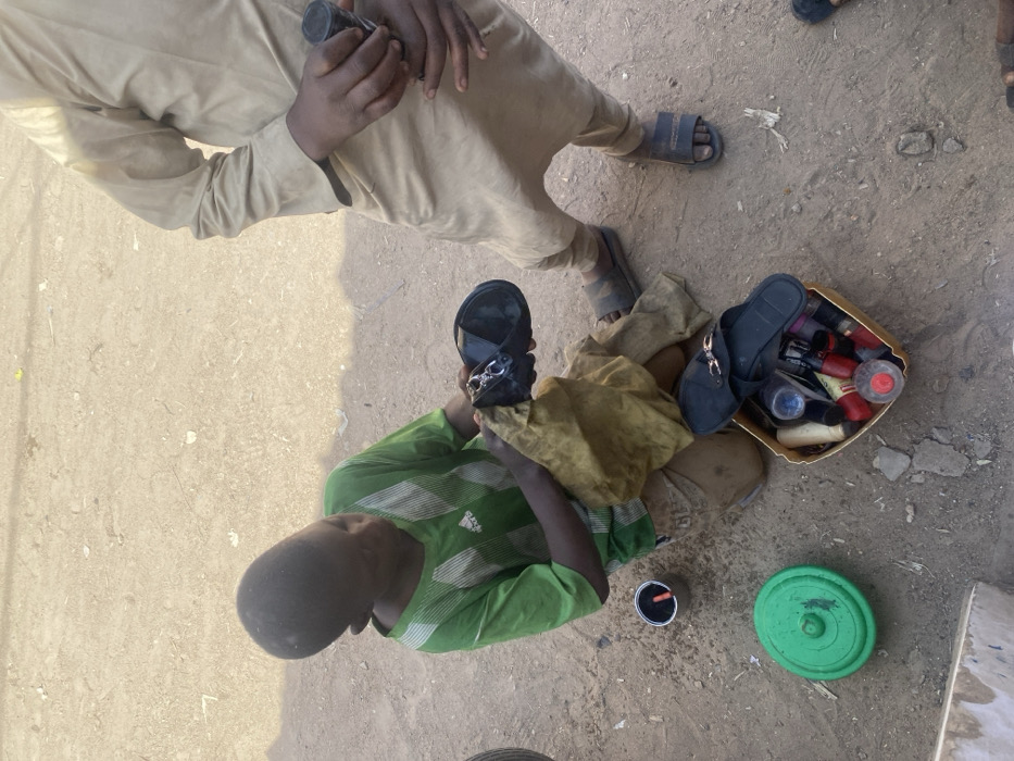The scene is set on a dry, light brown dirt ground in Chiranchi, Nigeria, under natural daylight. A young male, appearing to be 8-12 years old, wears a green Adidas t-shirt with white vertical stripes and light brown knee-length shorts. He is kneeling on the ground, actively cleaning a black sandal with a tan-colored cloth. To his left, a small open metallic can with black shoe polish and a red-tipped applicator rests on the ground, alongside a green circular plastic lid. Below and to his right, a yellow rectangular plastic container, possibly repurposed, holds an assortment of shoe care products and a second black sandal featuring a metal embellishment. Standing partially visible to the right of the boy is an adult male, dressed in a tan long-sleeved garment and dark sandals. The adult's hands are visible, holding a black cylindrical object.