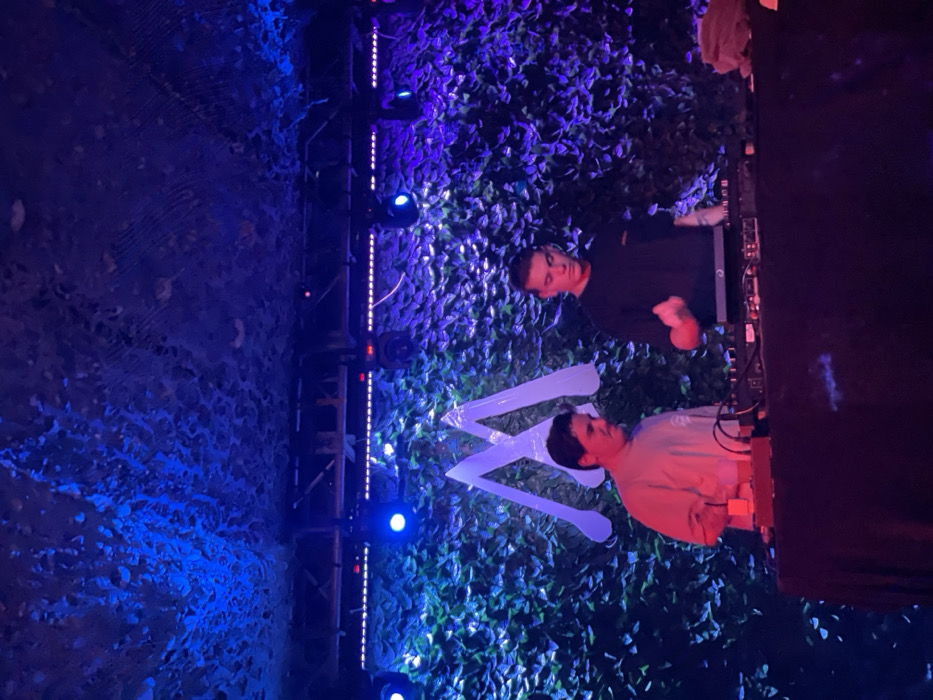Two men stand at a DJ booth, backlit with blue and purple lights. The background is a wall of green foliage. A large white “M” adorns the wall behind the men. Stage lighting rigs are visible on the left. One man wears a black shirt, while the other wears a light-colored shirt. They both face the camera, engaged in DJing activities.
