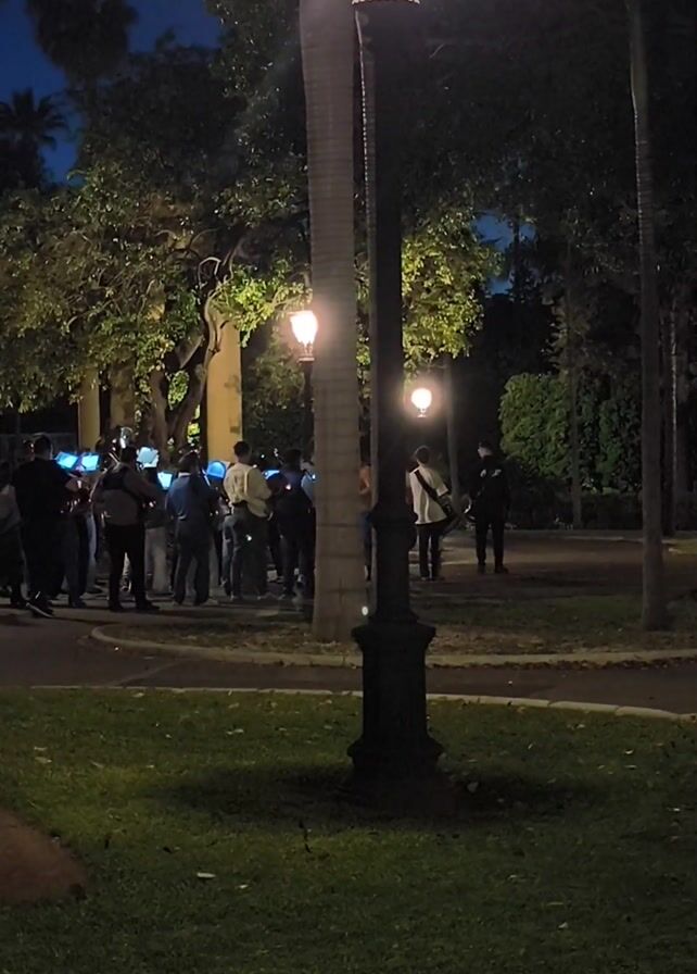 group of people gathered in a park at night, illuminated by lamplight. Most of them are standing close together, and some appear to be wearing blue headwear. A few individuals are walking away from the group. The park setting includes trees, grass, and paved walkways. The night sky is visible in the background. The scene is captured from a stationary position behind a lamppost, providing a slightly obstructed view of the gathering.