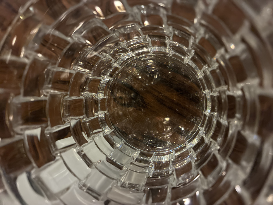 close-up view looking into a clear glass container with a textured, woven pattern