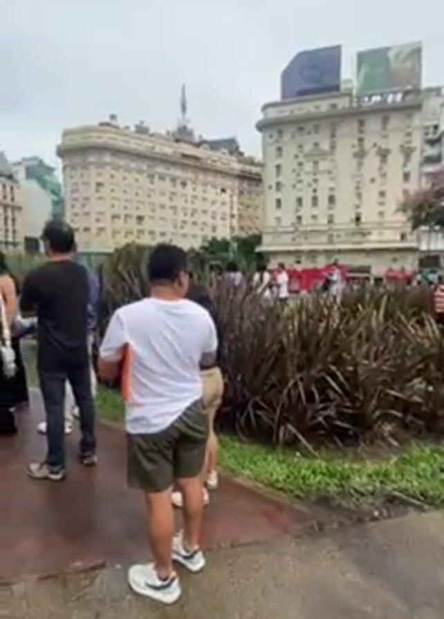 group of people on a city street, standing on a red brick path. In the background is the Obelisco de Buenos Aires, a tall, white obelisk. Next to it is a large, green bush shaped into the letters "BA." The people are dressed in casual clothing and appear to be tourists or visitors taking pictures of the landmark. There are buildings in the background as well. The sky is overcast, suggesting it might be a cloudy or rainy day. The overall impression is that this is a tourist spot in Buenos Aires, Argentina.