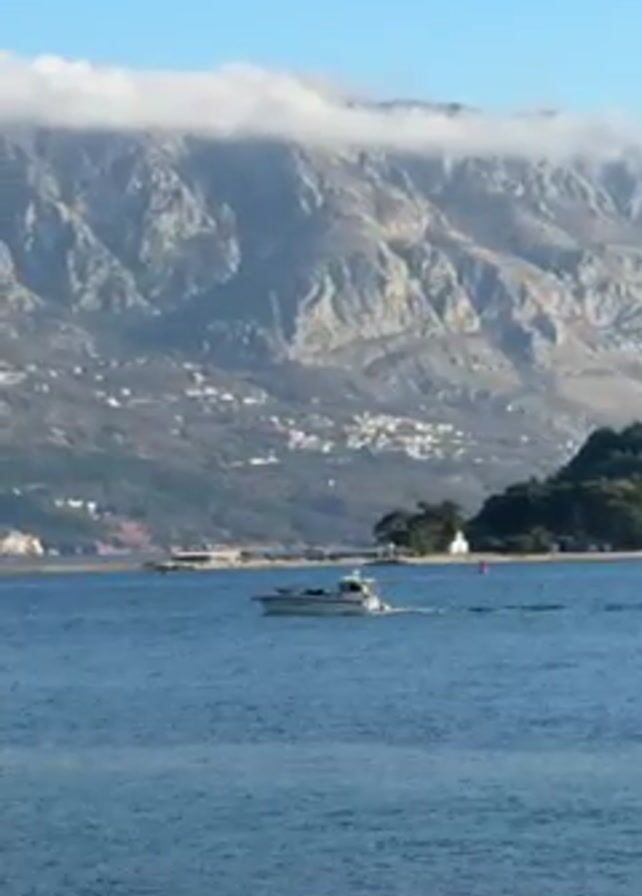 motorboat moving on a body of water. In the background are mountains with a town visible on the slopes. The sky is blue with some clouds lingering at the top of the mountains. A small, partially tree-covered island is visible to the right.