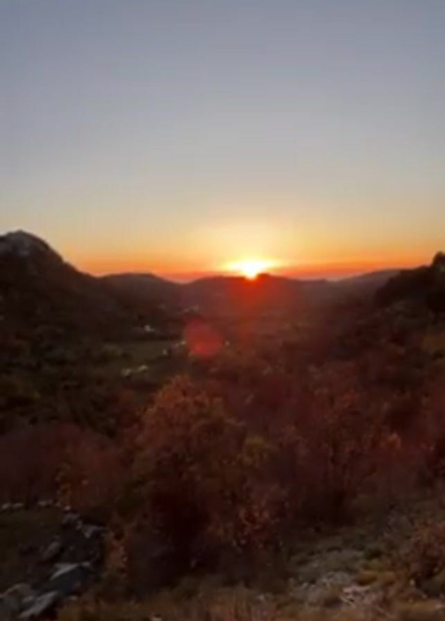 sunset over a valley with mountains on either side. The sun is a bright orange and the sky is a gradient of orange and blue. The valley is filled with trees. Traffic can be heard in the background.