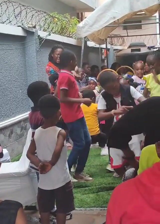 group of children and a few adults at an outdoor gathering, possibly a party. The children are dancing to music under a white tent. A young boy in a white t-shirt, red shorts, and a black vest is in the center, showing off his dance moves, while other children watch him, some joining in. The setting appears to be a backyard or outdoor event space with a fence in the background. A sign for "Events & Catering" with a phone number is visible on the tent. People are dressed casually, and the atmosphere seems festive.