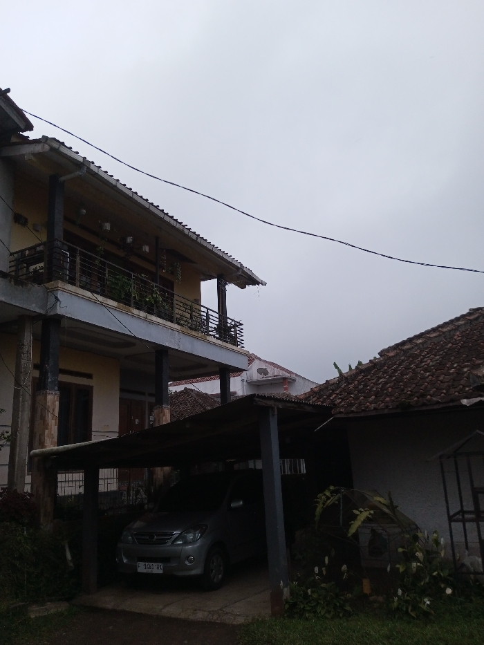The image depicts a residential street scene under an overcast sky, specified to be in Ivato, Madagascar. The central subject is a two-story building with a light-colored facade on the lower level and an upper balcony featuring a dark metal railing and potted plants. The roof of this building consists of dark, possibly terracotta-style tiles. Pillars on the ground floor are clad with patterned, multi-toned material. Dark-framed windows and doors are visible on the lower level. In the foreground, a dark-roofed carport covers a silver or light gray minivan, possibly a Toyota Avanza, with a visible license plate "F 1463 HK". The ground beneath the carport is paved concrete. To the right of the carport and extending behind it, another building with a traditional dark tiled roof and light-colored walls is partially visible. Various green vegetation, including plants with white flowers, is present in the foreground, around the carport, and on the balconies. A single dark cable or utility wire traverses the upper portion of the frame against the uniform gray sky. No individuals are visible.