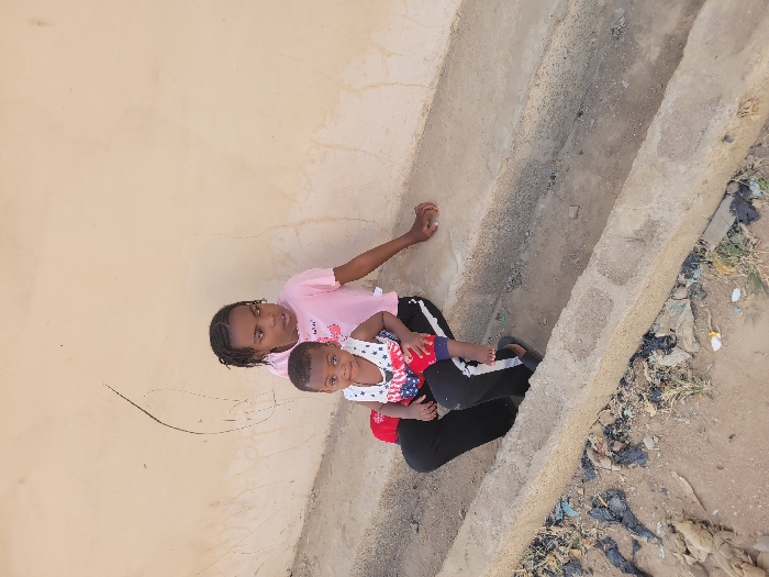 Two individuals are seated outdoors in Suleja, Nigeria, against a light beige concrete wall. An older female, with braided hair, wears a light pink short-sleeved top and black trousers with white side stripes. She is seated on the concrete lip of a drainage channel, with her right hand resting on the channel's edge. On her lap sits a younger individual, a toddler, wearing a white tank top with blue stars and red accents. The toddler's feet are bare. The older individual's gaze is directed slightly to the right, away from the camera, while the toddler looks toward the camera with a subtle smile. The concrete drainage channel, formed by two parallel concrete blocks, runs horizontally across the midground. The foreground consists of bare dirt ground scattered with dark plastic debris, light-colored crumpled material, and sparse patches of dry grass and weeds. The background wall exhibits minor cracks and a single vertical dark streak.